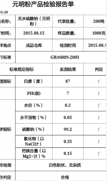 7 、主要用作合成洗滌劑的填充料。造紙工業(yè)用于制造硫酸鹽紙漿時的蒸煮劑。玻璃工業(yè)用以代替純堿?;瘜W工業(yè)用作制造硫化鈉、硅酸鈉和其他化工產(chǎn)品的原料。紡織工業(yè)用于調(diào)配維尼綸紡絲凝固浴。醫(yī)藥工業(yè)用作緩瀉劑。還用于有色冶金、皮革等方面。